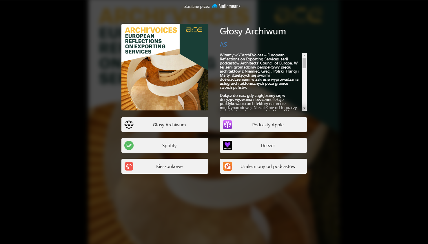 „Archi'Voices – European Reflections on Exporting Services”, seria podcastów Architects' Council of Europe, przedstawia podróż europejskich architektów, którzy rozszerzają swoje usługi na arenie międzynarodowej. To doświadczenie, które niesie ze sobą wyzwanie wyniesienia wiedzy architektonicznej poza znane granice, sprawia, że praktyka architektoniczna to inna metoda, którą należy przeanalizować i zrównoważyć. W różnych odcinkach architekci omawiają różne aspekty tego procesu, takie jak poruszanie się po różnych przepisach i kodeksach, dostosowywanie się do nieznanych sposobów życia lub godzenie różnic kulturowych. Te przeszkody wymagają nie tylko umiejętności technicznych, ale także zdolności do skutecznej komunikacji ponad barierami językowymi i podziałami kulturowymi. Każdy międzynarodowy projekt staje się wyjątkowym doświadczeniem, wymagającym nie tylko wiedzy technicznej, ale także dyplomacji, świadomości kulturowej i zdolności adaptacji.